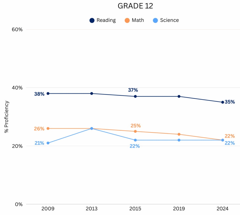 As of 2024, only 22% of 12th-grade students performed at or above the Proficient level in mathematics, 35% in reading, and about 22% in science.. These results reflect a steady decline or stagnation across subjects since 2009, with little improvement among higher performers and continued gaps for lower-performing students.