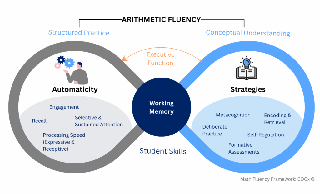 This framework illustrates how arithmetic fluency is strengthened through the integration of structured practice and conceptual understanding, which McNeil et al. (2025) identify as mutually reinforcing components of fluent mathematical thinking. Structured practice develops automaticity, while conceptual understanding develops flexible strategies, and together they reduce working-memory demands during problem solving. Working memory sits at the center because, as the research emphasizes, students who can retrieve facts efficiently free cognitive resources for higher-level reasoning rather than calculation steps. Executive functions operate across both sides, coordinating attention, regulation, and strategy use, enabling learners to connect prior knowledge with new information and monitor their own thinking as fluency develops.